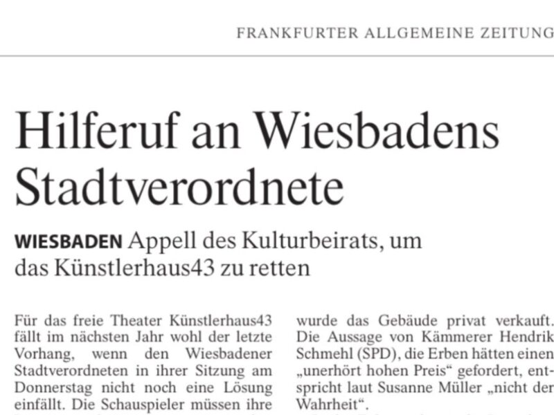 Das Theater kuenstlerhaus43 hat möglicherweise neue Räume gefunden. Lesen Sie hier unsere Stellungnahme und den Artikel des Wiesbadener Kurier.